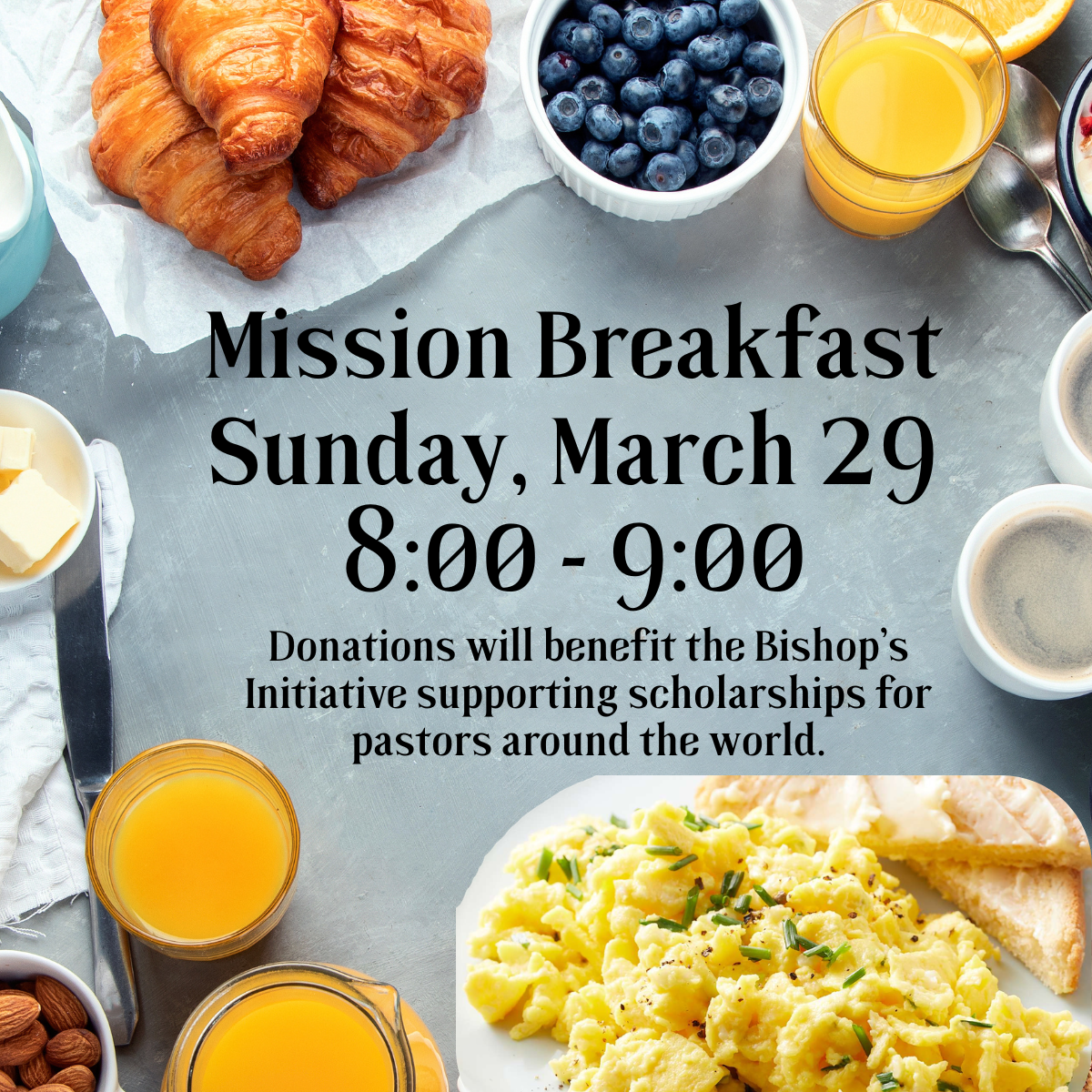 The Council of Bishops is asking ALL the United Methodist churches in the United States to UNITE in the weeks following Easter to raise money for a goal of endowing 500 scholarships for pastors outside the U.S. to receive education equivalent to that which our U.S. pastors receive. The goal is well-prepared leaders who can serve in some of the most challenging missional communities around the world. The Missions/Outreach Team has chosen this initiative as our recipient of funds from our March 29 Missions Breakfast. The breakfast will be eggs, sausage, fruit, and beverages and maybe some sweets if our regular makers agree to do those! Breakfast will be served from 8:00 – 9:00 a.m. on Palm Sunday.
