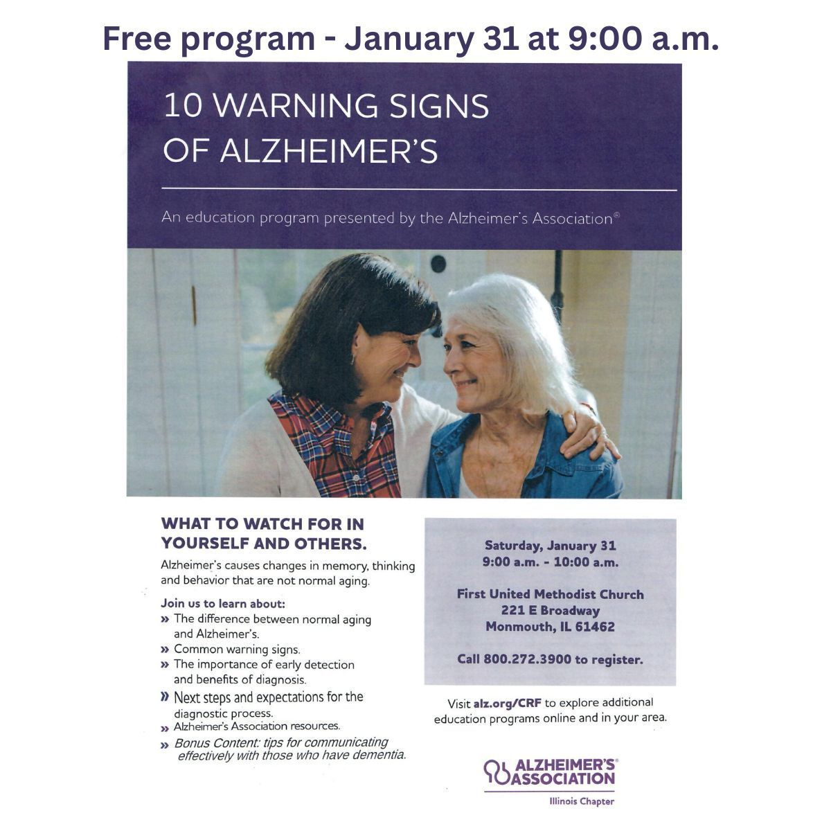 Dream Team is planning to have three Saturday morning workshops. The first will be on January 31 from 9:00-10:ooam in the Chapel. The topic will be Alzheimers - "Know the 10 Warning Signs". It will also include information about caregiving. The workshop will provide information that will be helpful to all adults. Also, save the dates of February 28 and March 28 from 9:00-10:00 a.m. for other informational meetings. More information will follow.