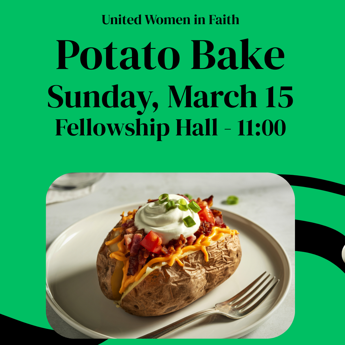 United Women in Faith invite you to lunch on Sunday, March 15 at 11:00 a.m. in Fellowship Hall. Come down after worship and have a cup of coffee while you wait for the Potato Bake to begin.